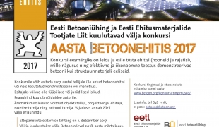 На сегодняшнем дне бетона в Эстонском музее кино Союз бетона Эстонии назвал победителей конкурса «Бетонное строение 2017 года». Бетонное строение 2017 года – частный жилой дом в Виймси. Главный приз конкурса – заказчик Майт Рыымусаар. Приз архитектора: Mateusz Kuo Stolarski (Tamizo Architects, Польша);Приз конструктора: Андрей Кервалишвили (Nordecon Betoon OÜ);Приз за строительные работы: Nordecon Betoon OÜ;…
